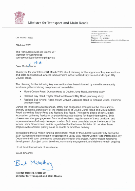 There is a clear need to fund and deliver safety and congestion upgrades on Mount Cotton Road, particularly at the Double Jump Road, Valley Way and Beenleigh-Redland Bay Road intersections, and the Redland Bay Road and Duncan Road intersections.